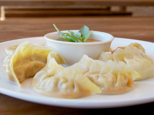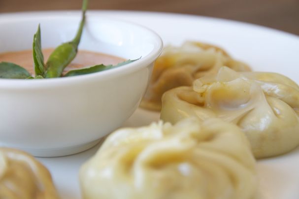 Momos are Nepalese and Tibetan dumplings that are particularly found in the Himalayan region. The dough is made from flour and water. At naanu, our Nepalese cook Jagadip Gourung prepares the fresh and artistically shaped momos by hand, with a vegetarian tofu-vegetable or chicken filling. The momos are steamed and served with a spicy dip.